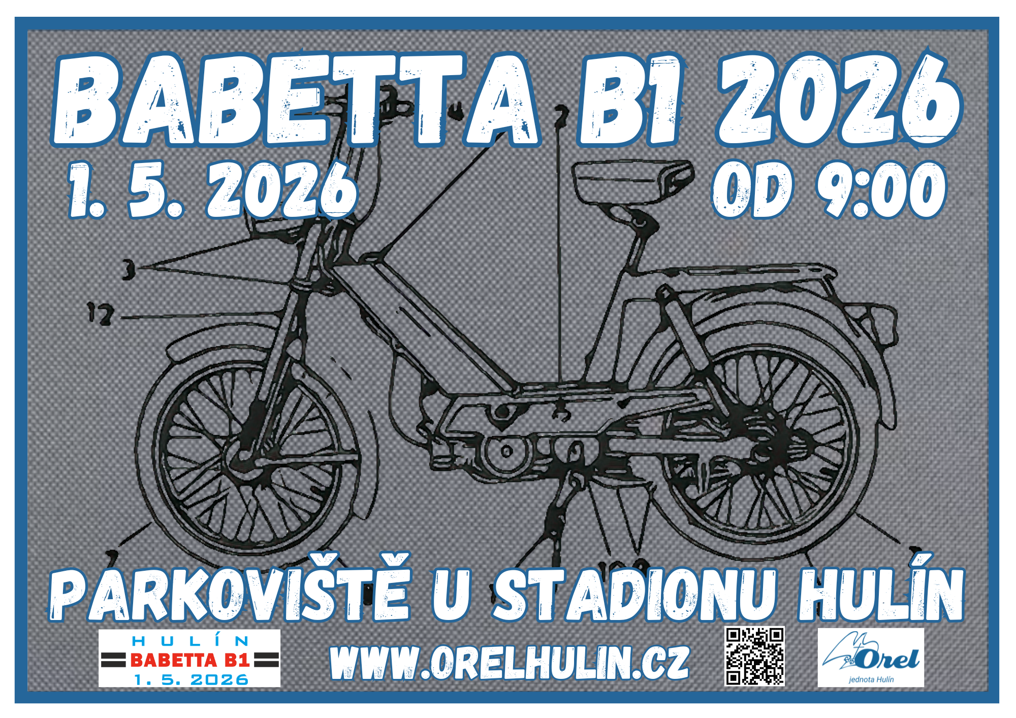 Zveme všechny milovníky motoristických sportů na prvomájové setkání populárních jednostopých vozidel Babetta. Stejně jako v minulých letech nás čeká spousta soutěží, zábavy a doprovodného programu. Soutěžící se budou moci prezentovat od 8:30 na parkovišti u hulínského stadionu, tak abychom začali v 9:00 závodit. Účastníci co vyplní a odešlou přihlášku do 13. 4. 2025 se mohou těšit na dar ve formě trička s logem B1 a ti závodníci co uspějí ve svých kategoriích i na medaile, poháry, diplomy, slávu a věcné odměny.